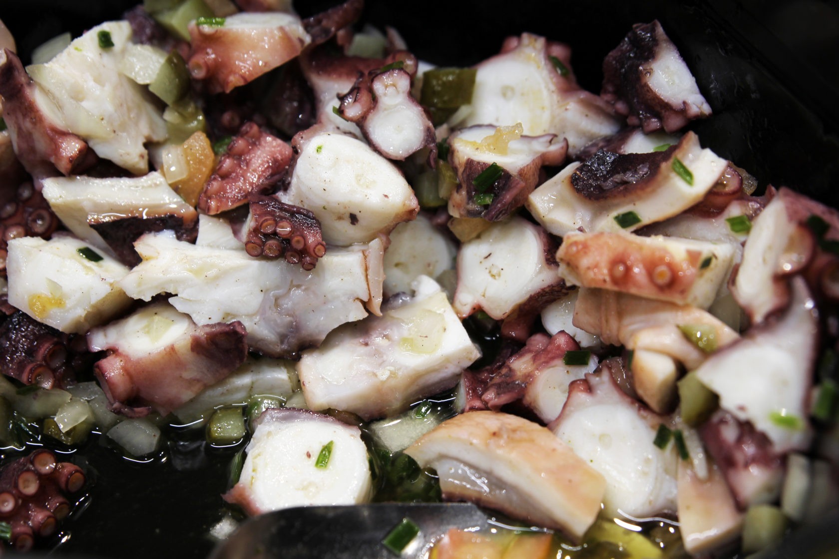 Poulpe cuit dans un court bouillon, taillé en morceaux et mariné dans de l'huile de tournesol et d'olive avec de l'oignon, cornichon, ciboulette et tomate. Le tout est relevé avec une pointe de tabasco.