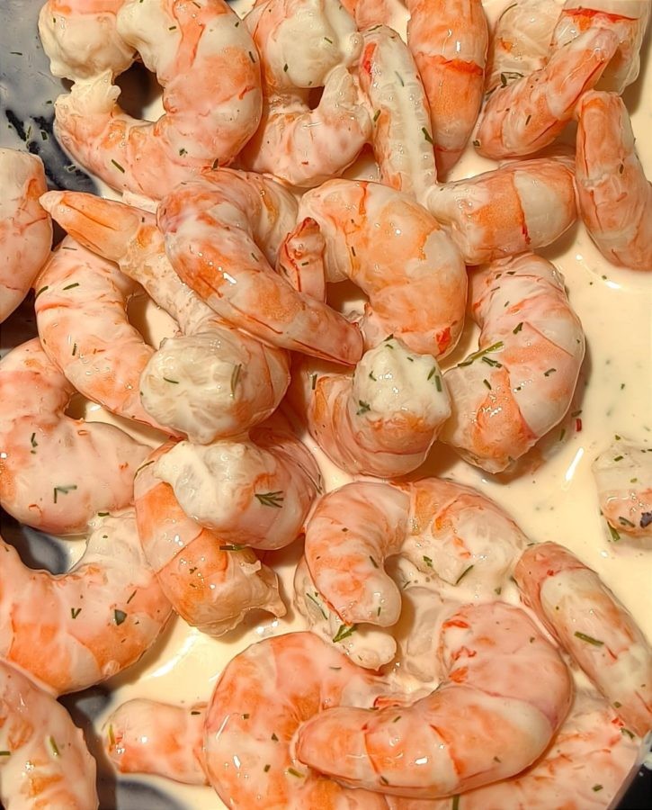 Crevettes bio de Madagascar cuites marinées dans une sauce mayonnaise allégée au yaourt et parfumée à l'aneth.