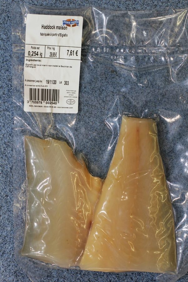 Eglefin salé au sec brut de Camargue, puis fumés Sans colorant par nos soins à la sciure de Hêtre. Une fois fumé, l'églefin change de nom et devient du Haddock !!