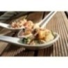 Salade composée de crevettes bio de Madagasgar, surimi, courgette, poivron rouge, carottes, raisin, agrumes et d'une sauce à base de mayonnaise allègée avec du yaourt et parfumée à la menthe.